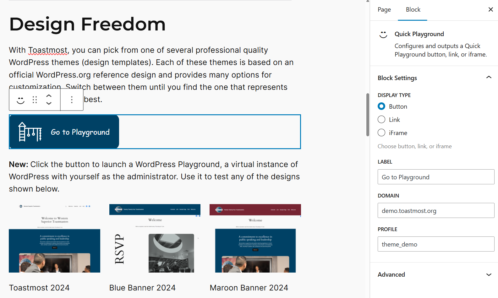 The Quick Playground block lets you specify a Playground profile and display options (button, link, or embedded iFrame).